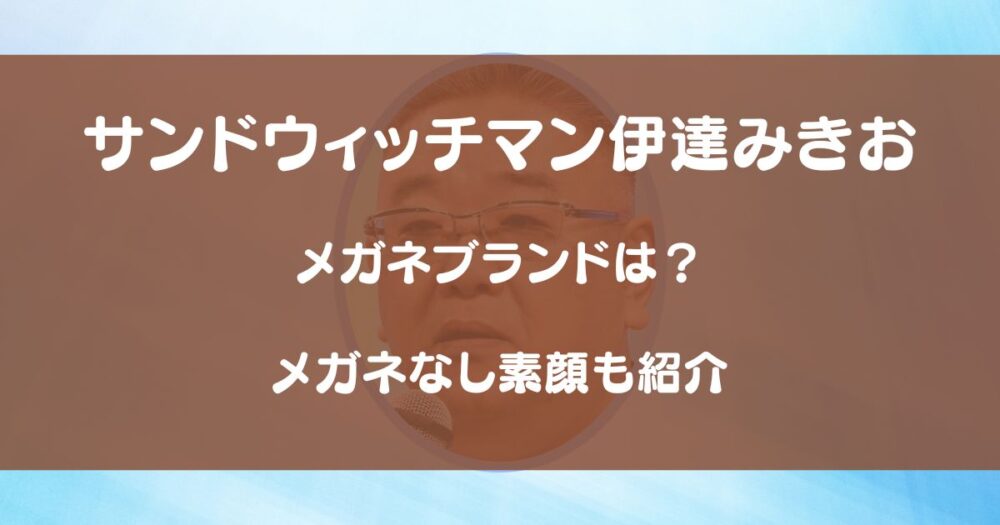 サンドウィッチマンの伊達みきおさんといえば、いつもオシャレなメガネをかけている姿が印象的ですよね。 あの特徴的なメガネは、一体どこのブランドのものなのでしょうか?また、トレードマークのメガネを外した「メガネなし素顔」も気になっている方が多... -